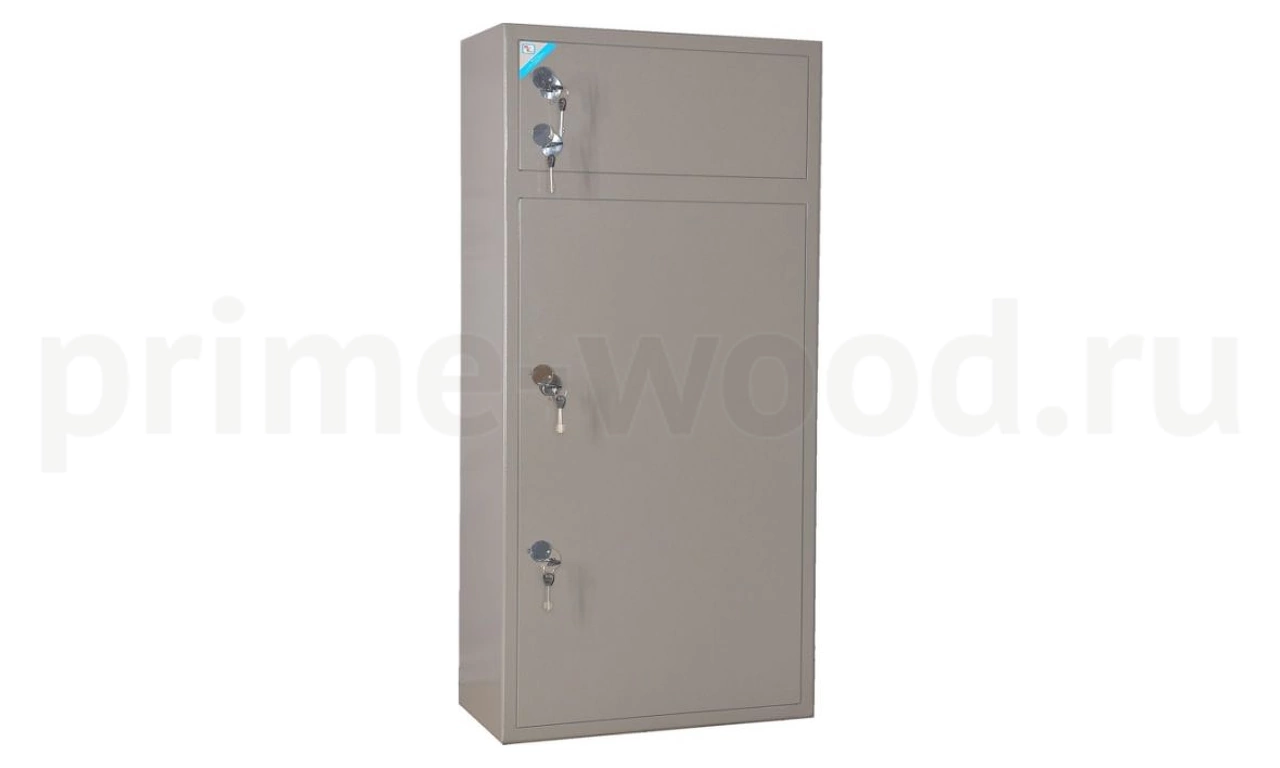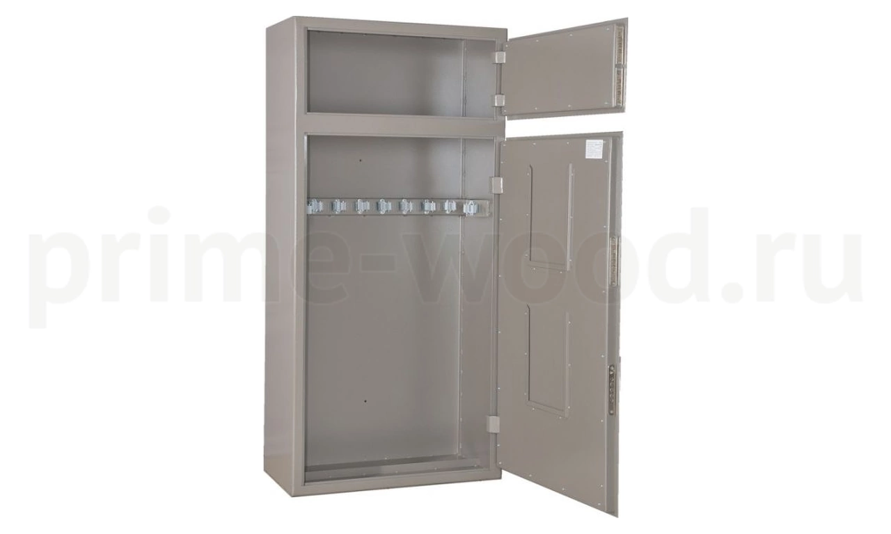 Сейф двухсекционный, на 10 стволов, оборудован дополнительной секцией для хранения боеприпасов. Ложементы — металлические держатели с резиновыми роликами. На внутреннюю сторону двери устанавливаются 2 рамки под опись.