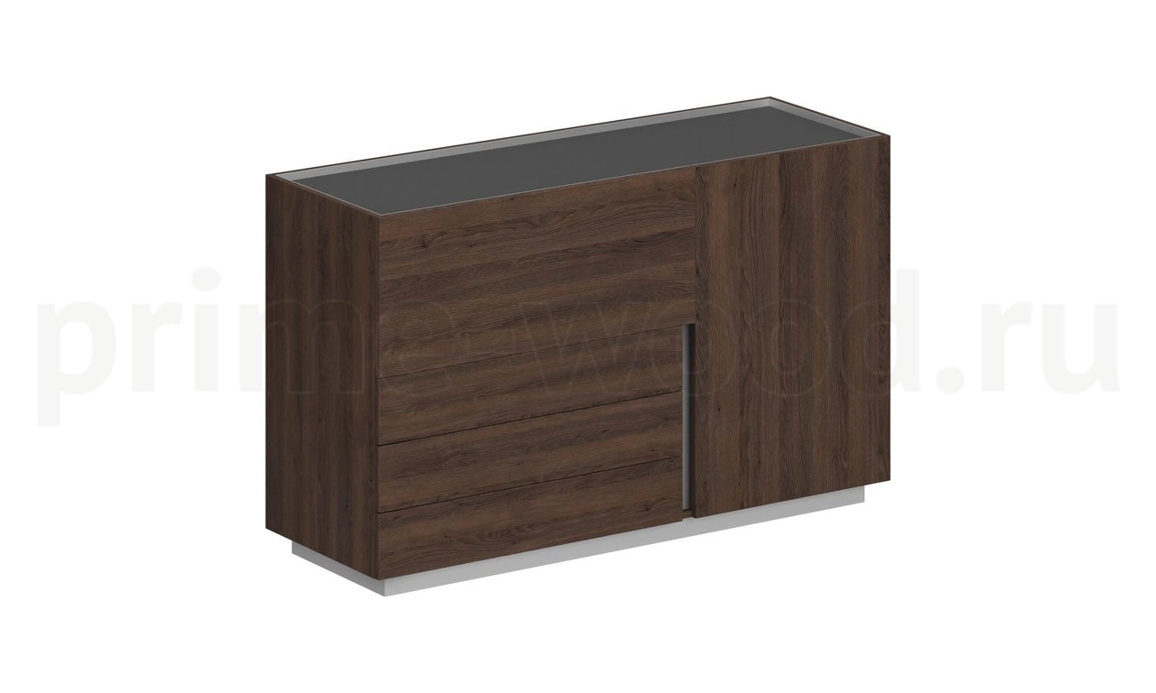 Шкаф на регулируемых опорах с 3-мя ящиками и 2-мя распашными фасадами. Распашной фасад над ящиками откидной, секретерного типа, с механизмами плавного открывания (газ. лифтами или механизмом секретерным). При открывании этого фасада он позиционируется вровень с полкой. Петли (Hettich) с доводчиками. В секции за высоким распашным фасадом одна съемная полка. Присадка под полку с доп. перфорацией +- 32 мм. Наружные боковины и задняя стенка из ЛДСП 18 мм в кромке ПВХ 2 мм только по верхнему торцу, текстура вертикально.
